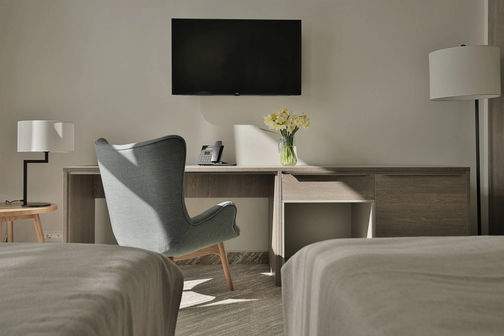 Площадь номера - 30 кв.м. 2 осн. места. 1 доп. место. Мебель: вешалка, зеркало, кровати односпальные /одна двуспальная кровать, прикроватные тумбочки, стол, стул, шкаф. Оборудование: гладильная доска, кондиционер, мини-холодильник, сейф, телевизор, телефон, утюг, чайная станция. Санузел: с душем, тапочки, туалетные принадлежности, фен, халат. Сервис: Wi-Fi бесплатно, смена полотенец, смена постельного белья, уборка номера.