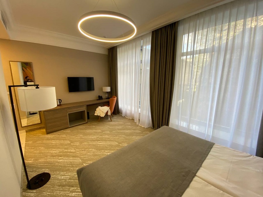 Площадь номера - 45 кв.м. 2 осн. места. 1 доп. место. Мебель: вешалка, зеркало, кровати односпальные /одна двуспальная кровать, прикроватные тумбочки, стол, стул, шкаф. Оборудование: гладильная доска, кондиционер, мини-холодильник, сейф, телевизор, телефон, утюг, чайная станция. Санузел: с душевой кабиной, тапочки, туалетные принадлежности, фен, халат. Сервис: Wi-Fi бесплатно, смена полотенец, смена постельного белья, уборка номера. Терраса.